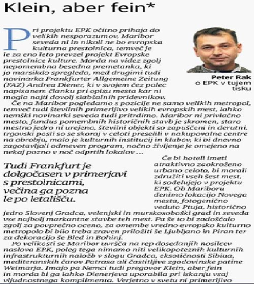 In ker je temu tako, je najbolje, če se Slovenci že enkrat nehamo ubadati s tem kaj si o nas mislijo v tujini, EPK ne organiziramo zato, da bi napravili vtis na tuje novinarje in obiskovalce, temveč da bi v Mariboru in petih partnerskih mestih naredili vsaj minimalen premik na področju kvalitete življenja. Nenazadnje je tudi Frankfurt v primerjavi z Berlinom, Londonom, New Yorkom, Sankt Petersburgom ali Šanghajem precej dolgočasna destinacija, večina popotnikov pozna le tamkajšnje letališke terminale.